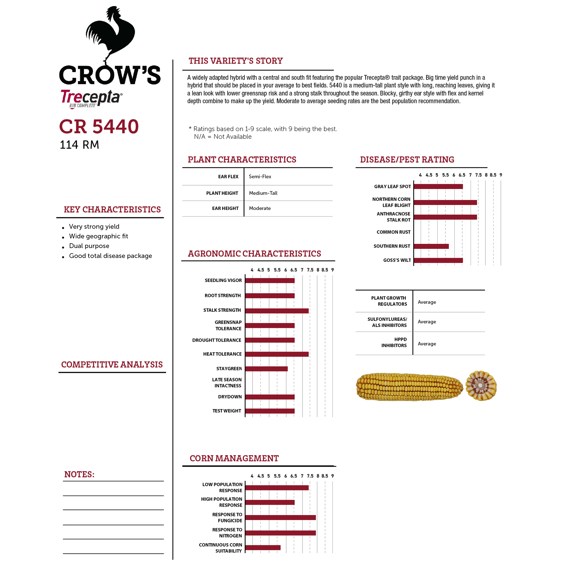 A widely adapted hybrid with a central and south fit featuring the popular Trecepta® trait package. Big time yield punch in a hybrid that should be place on your average to best fields. 5440 is a medium-tall plant style with long, reaching leaves which gives it a lean appearance. Very strong greensnap tolerance and strong late season standability. Blocky, girthy ear style with flex and good kernel depth deliver on yield. Moderate to average seeding rates are recommended for 5440.