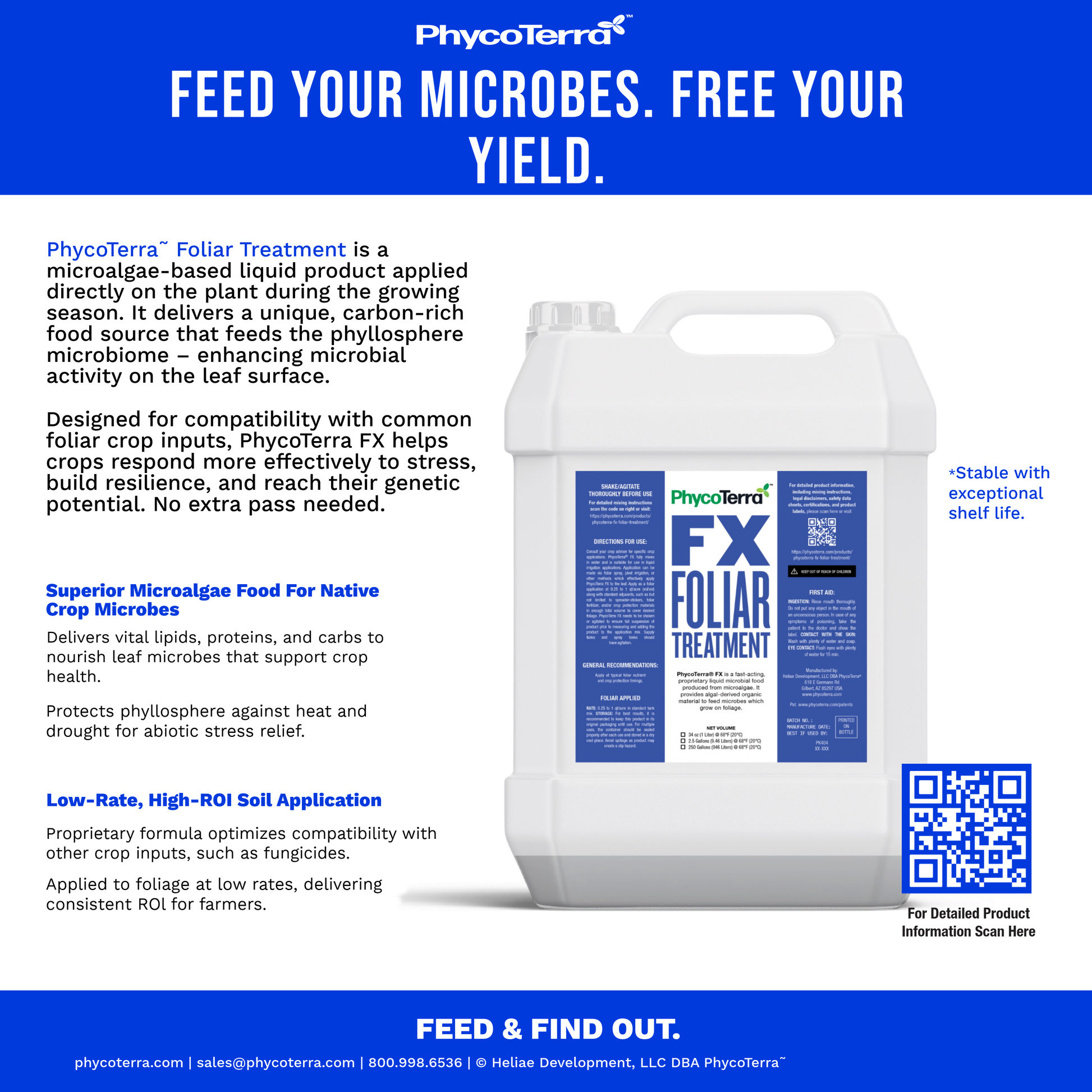 PhycoTerra FX™ is a microalgae-based liquid product applied directly on the plant during the growing season. It delivers a unique, carbon-rich food source that feeds the phyllosphere microbiome – enhancing microbial activity on the leaf surface.